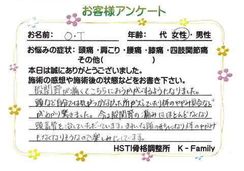 今は股関節の痛みはほとんどなくなり頭蓋骨を治していただいています。