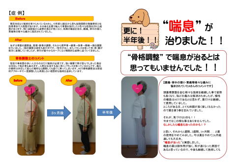 特に退院後から姿勢の悪さが気になり、持病の喘息を含め、腰痛、背中の張り、胃痛等の様々な痛みに悩んでいました。